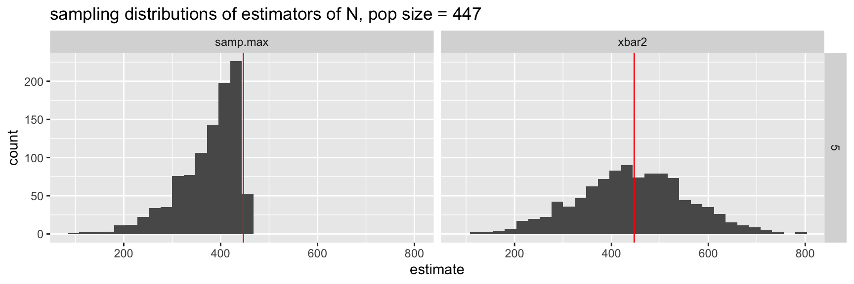 ggtitle("sampling distributions of estimators of N, pop size = 447")